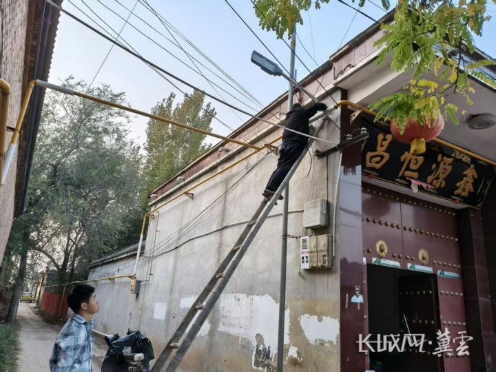 在沙圪塔镇南沙村,施工队正在安装路灯。