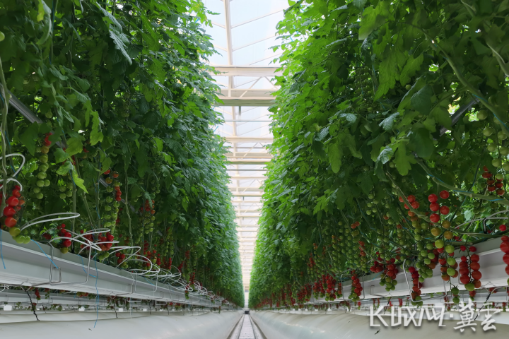 据基地负责人王在勇介绍,该基地建设规模94亩,现有智能化玻璃温室22500平方米,种植的樱桃番茄采用无土椰糠栽培,利用潮汐式育苗床自动精准供给水肥,环境传感器实时回传温湿度数据,实现了对农作物生长全周期的精准管理。到12月中旬,就进入采收期,采收期可持续至2026年7月,每平方米产量预计在15公斤至25公斤,按当前市场行情估算,仅鲜果销售一项,年产值即可达300万至500万元。