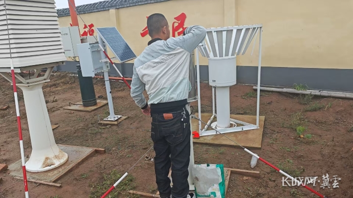 大名县气象局工作人员在维护区域站翻斗雨量传感器。